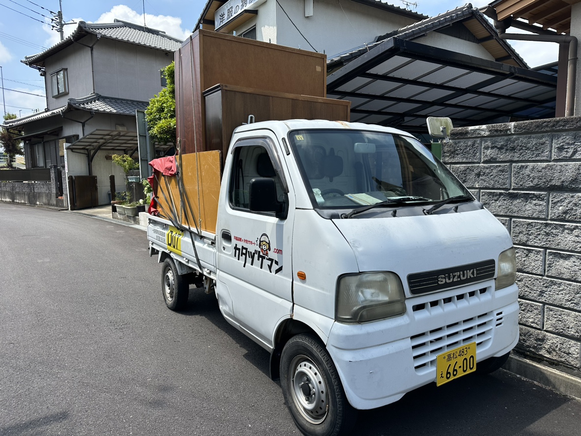 高松市香川町に軽トラック1台2名で出動しました! 大きめの本棚3点とカラーボックス、植木鉢・ブロックをたくさん、ゴミ箱などを回収しました♪ たくさん載せることができて、お客様に喜んでいただけました(^^)/